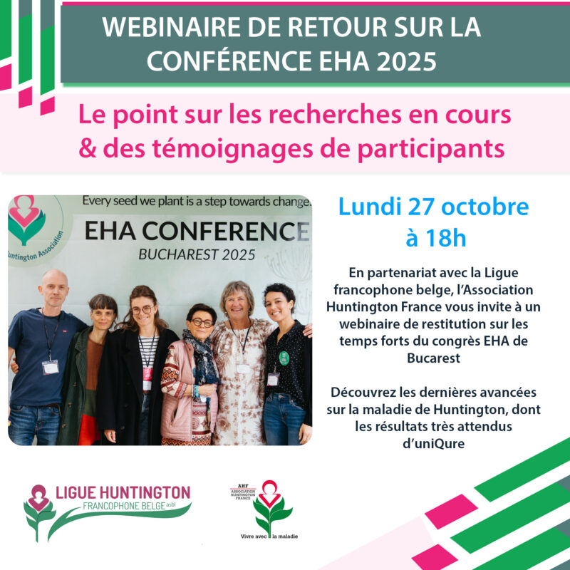En collaboration avec la Ligue Francophone Belge, l’Association Huntington France (AHF) vous invite à un webinaire de restitution consacré aux temps forts du congrès de l’EHA (European Huntington Association), qui a eu lieu à Bucarest en septembre dernier. Cet événement a réuni des familles, la communauté scientifique, médicale et associative de toute l’Europe, autour des […]